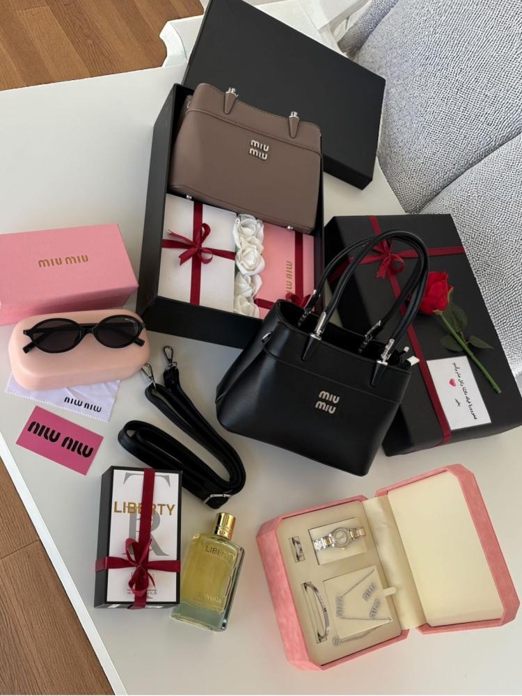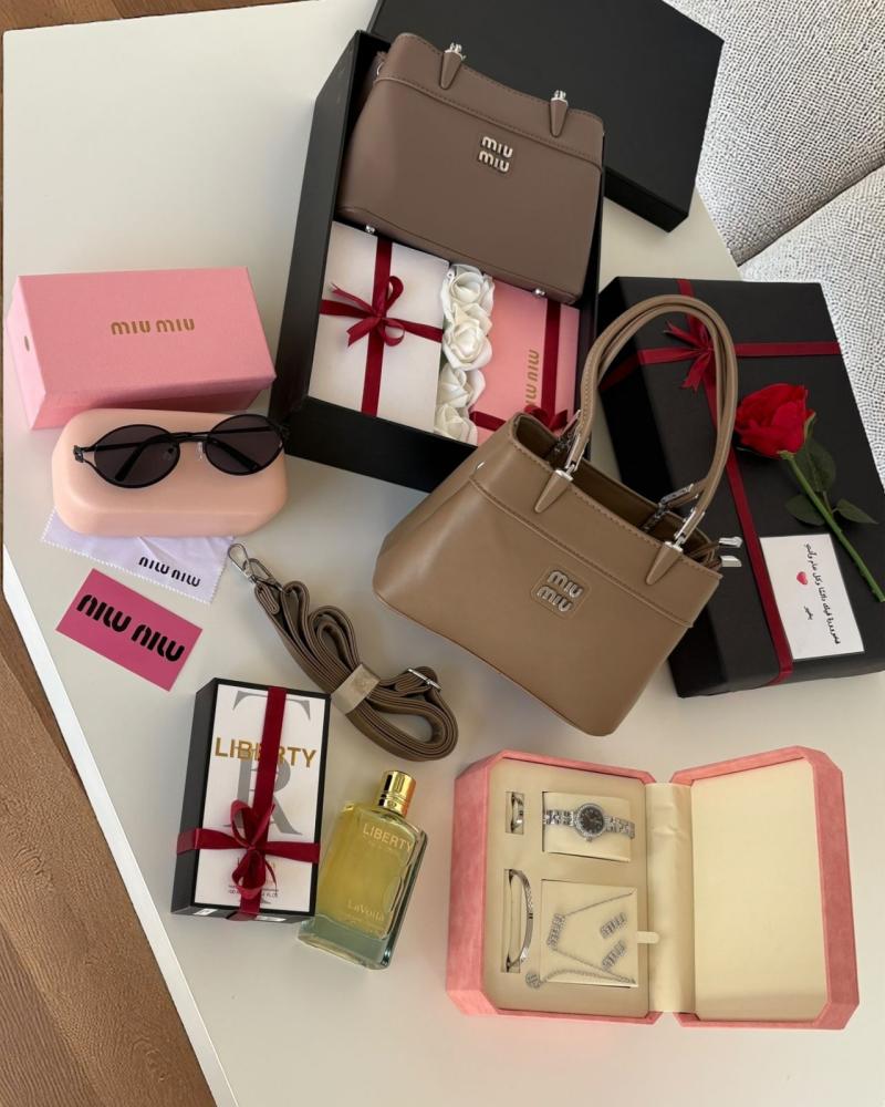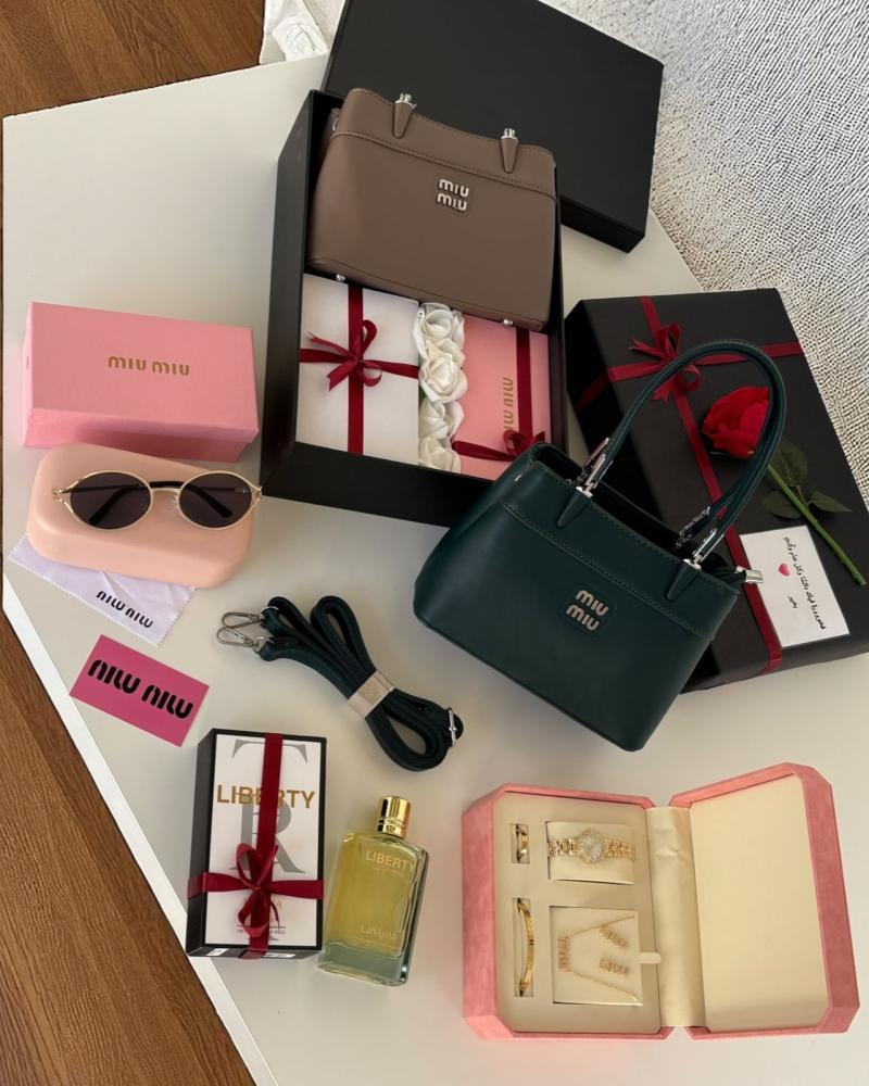 من شنط Miu Miu العصرية، إلى الإكسسوارات الفاخرة، مرورًا بالنظارات الأنيقة والعطور الجذابة… وصولًا إلى علب الهدايا المرتبة بوردة حمراء ولمسة راقية تجعل كل هدية تحفة بحد ذاتها 🎁🌹